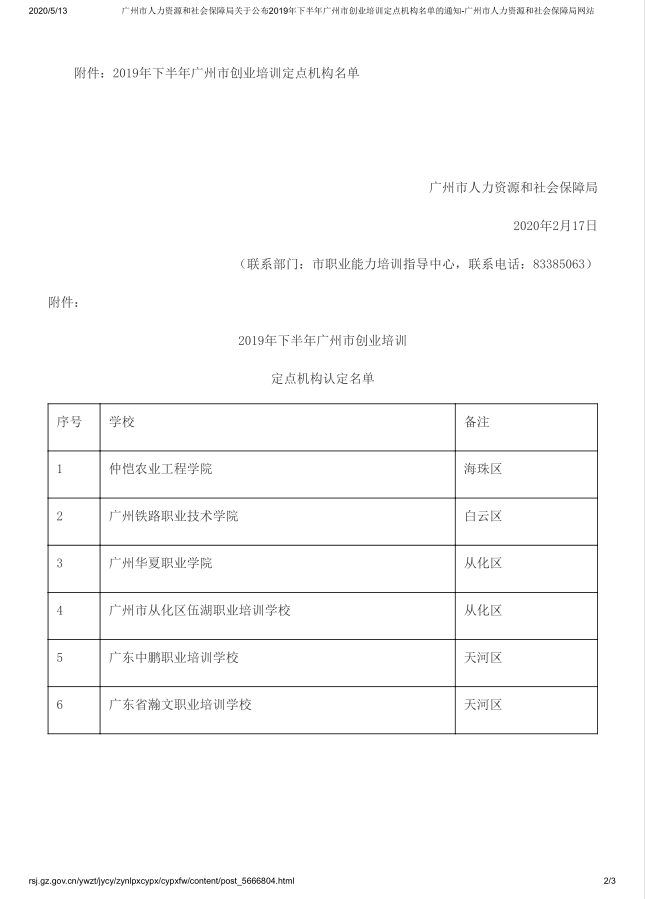 广州市人力资源和社会保障局关于公布2019下半年广州市创业培训定点机构名单的通知
