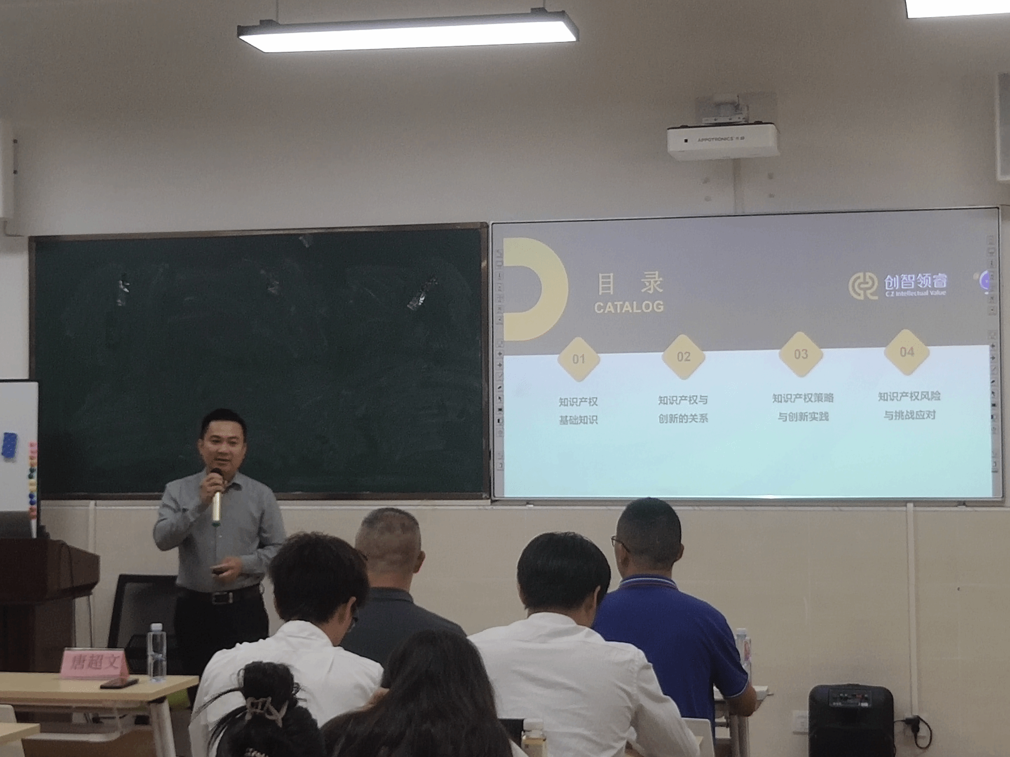 讲座现场,唐超文结合自身实际经验讲解了知识产权基础知识、知识产权与创新的关系、知识产权策略与创新实践、知识产权风险与挑战应对等四部分主要内容,深入讲解了知识产权在现代创新体系中的重要作用及其对个人和企业的影响,并提出了有效的知识产权策略与应对挑战的方法。在企业的专利布局策略上利用“小米公司强调系统管理和前瞻布局,拥有超过4万件全球专利”这一案例向同学们生动讲解专利壁垒在企业发展过程中的作用,为同学们提供了宝贵的经验和启示。