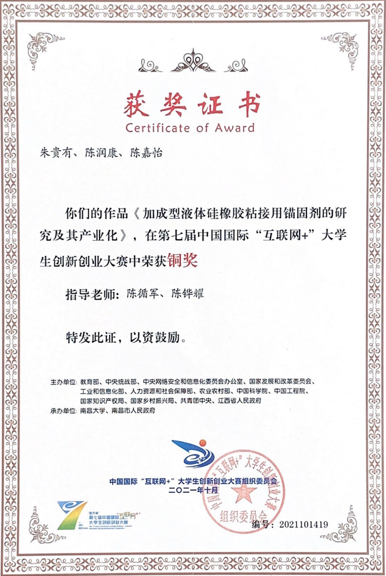 [2021.10]第七届“互联网+”铜奖-加成型液体硅胶粘接用锚固剂的研究及其产业化-朱贵有 陈润康 陈嘉怡(指导老师:陈循军 陈铧耀)